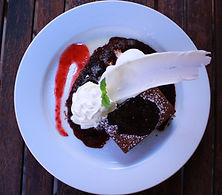 Warmed Mississippi mud cake served with chocolate sauce, vanilla ice cream and cream.